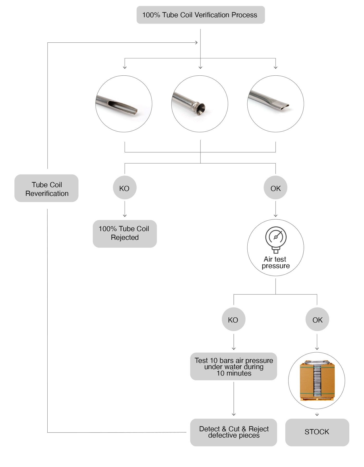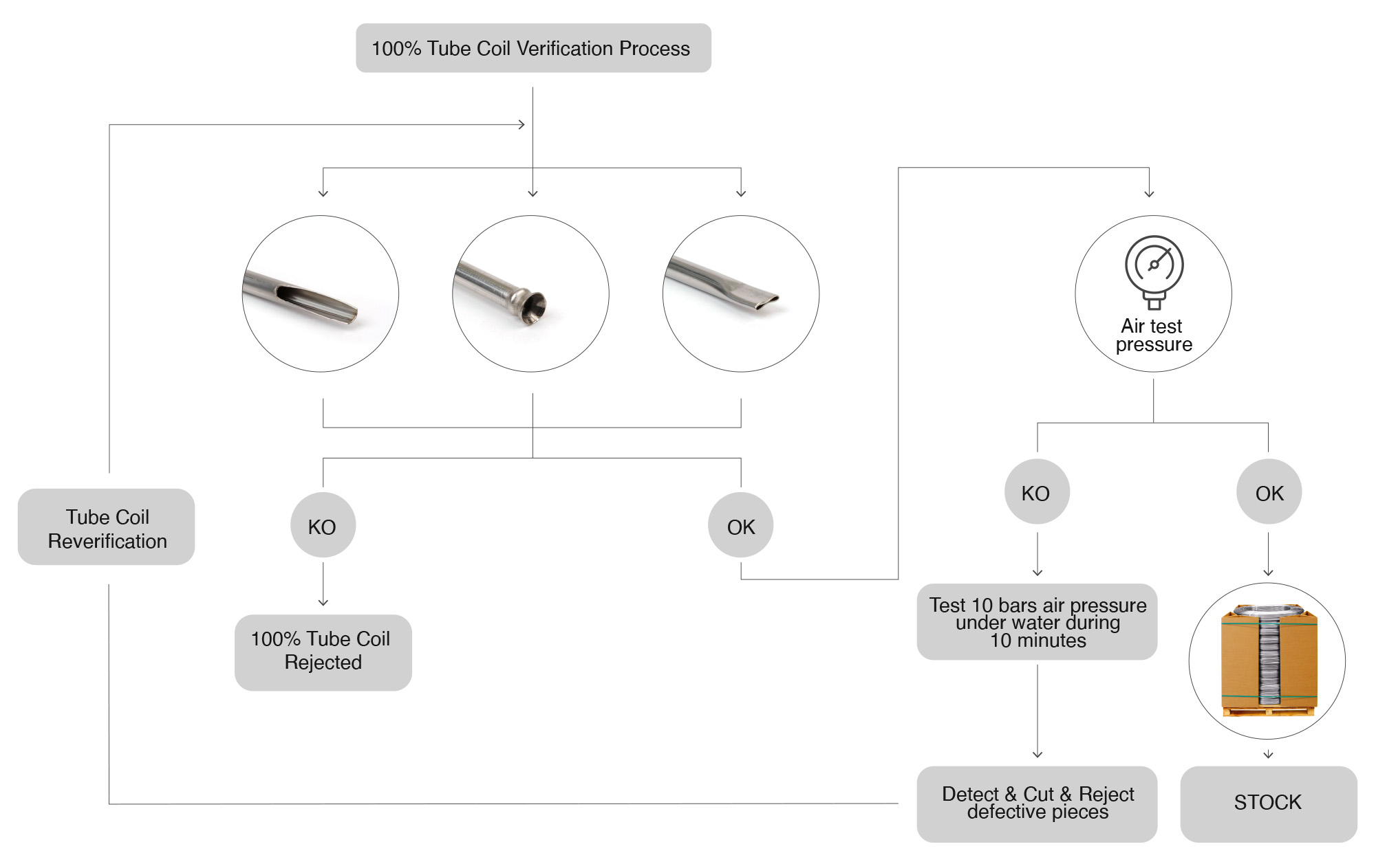 MACE verifica a 10-250 bar de pressió durant 15 minuts dins d’un tanc d’aigua, per tal d’analitzar que no hi hagi cap porositat en el tub. Es realitza aquest test per comptes d’altres, ja que s’ha demostrat, que el millor mètode és el de bombolla, ja què ofereix mes garanties d’estanqueïtat.